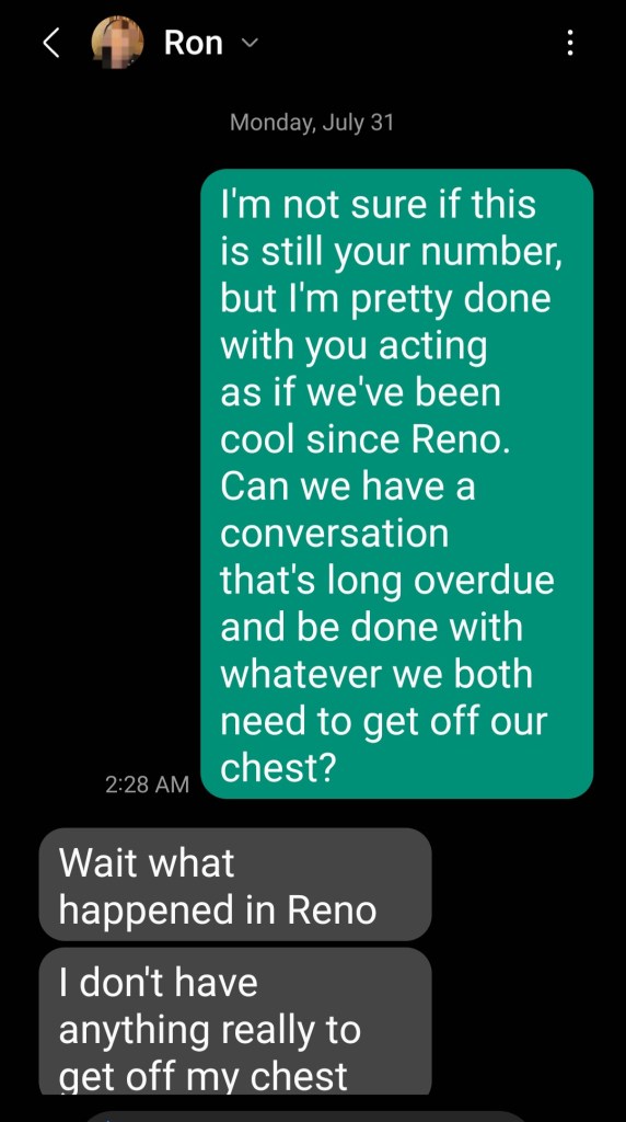 That Sunday I was walking with some dance peeps to their room to get some shots when – here comes my sign! … I see him walk out of his room. (I’ll assume it was his room) We locked eyes and I kept walking. I now know this man’s room number and I’m glad I’ve grown and am not a crazy ex-girlfriend. I’m crazy (all women are) just not that kind of crazy. So fast forward and I go into the traditional room he’s closing out. Drop my phone on the floor near the speaker and go dance. Out of my peripheral view I see someone reach down. I’m done dancing and went to grab my phone and it’s not where I left it. Conveniently it’s on the DJ table. Guess who’s mad again? – I’m thinking “Why is he touching my shit? Why does he think we’re friends? Nah. You want to act like we’re friends again we’re going to clear the air.” However, when I finally reached out, I wasn’t mad, I may have been slightly aggressive and maybe that’s why he responded the way he did?